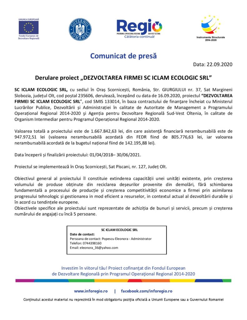 SC ICLAM ECOLOGIC SRL, cu sediul în Oraș Scornicești, România, Str. GIURGIULUI nr. 37, Sat Margineni Slobozia, județul Olt, cod poștal 235606,derulează, începând cu data de 16.09.2020, proiectul “DEZVOLTAREA FIRMEI SC ICLAM ECOLOGIC SRL”, cod SMIS 133014, în baza contractului de finanţare încheiat cu Ministerul Lucrărilor Publice, Dezvoltării și Administrației în calitate de Autoritate de Management a Programului Operațional Regional 2014-2020 şi Agenția pentru Dezvoltare Regională Sud-Vest Oltenia, în calitate de Organism Intermediar pentru Programul Operațional Regional 2014-2020.