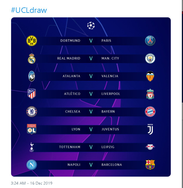 Iată programul complet din faza optimilor: Borussia Dortmund – PSG, Real Madrid – Manchester City, Atalanta – Valencia, Atletico Madrid – Liverpool, Chelsea – Bayern Munchen, Lyon – Juventus Torino, Tottenham – Leipzig, Napoli – Barcelona.