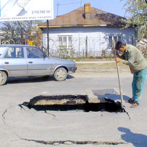 Desi poate gindul v-a dus la recenta nivelare a Bagdadului, practicata intensiv de bombardierele aliatilor, trebuie spus ca imaginea alaturata este totusi pur autohtona. Groapa in cauza, cu un diametru de vreo trei metri, poate fi vizitata oricind la intersectia strazii Toporasi cu Aleea Tufanele. Strada Toporasi, daca va amintiti, este una dintre arterele de circulatie care a beneficiat nu demult de atentia Primariei Craiova, fiind obiectul unor ample lucrari de asfaltare. Drept pentru care soferii de pe autobuzele Regiei Autonome de Transport si concurentii din slujba Fratilor Bacriz o strabateau, pina nu demult, fara vreo teama. Gratie standardelor inalte ale lucrarii si constiinciozitatii cu care a fost dusa la bun sfirsit, asfaltul a lasat-o mai moale si a facut loc ieri unei frumuseti de crater care i-a determinat pe multi dintre conducatorii auto care tranzitau zona sa calce ferm pedala de frina, sa traga cu disperare de volan si sa intre cu scrisnete de roti pe trotuarul din dreapta. Evitata asadar pe muchie de cutit de catre soferi, groapa se va consola, in cele din urma, cu gindul ca de inghitit tot va inghiti ceva: banii contribuabililor.