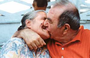 „Astia sintem, altceva nu mai gasim noi acu’, la etatea noastra“, se consoleaza ei, vazind ca altceva nu li se ofera. Si oricum, nici timp nu mai au de cautari… „Dracu’ m-a pus sa ma indragostesc de una mai tinara cu 16 ani… Acu’ nu-mi mai da pace, cica sa pun o vorba buna sa luam o camera amindoi, ca vine iarna si ii e frig…“, „se plinge“ de nenorocirea care a dat peste el Gheorghe Stroe, de 84 de ani. Nici n-a venit bine la camin acum un an, ca l-a si luat Getuta in primire. N-a avut timp nici sa faca o plimbare de recunoastere prin camin, sa vada si el cam care este oferta acolo. Adevarul e ca de agatat a agatat-o el, la o discutie pe banca. „I-am spus ca o iau acasa. De, ma gindeam eu ca prinde, dar nici chiar asa. Si culmea e ca si dupa ce a aflat ca nu am nimic, tot nu m-a lasat in pace“. Acum sint nedespartiti. Si atit de indragostiti unul de altul, ca nu se mai feresc sa-si ascunda iubirea, chit ca fiecare a lasat pe acasa un copilas, doi. Se plimba tinindu-se de mina, se imbratiseaza fara jena pe unde li se face chef. Si se pupa mai abitir ca la tinerete, spre satisfactia lui mos Gheorghe, care abia acum recunoaste ca batrinetea are si partile ei bune: „Are gura strimba, cred ca de-aia saruta asa bine!“