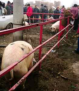 Ieri, in tirgul de saptamina al Craiovei erau mai multi crescatori decit cumparatori. Legati de unul din picioare cu sfoara si imbolditi din cind in cind sa se agite sa nu creada lumea ca sint bolnavi, sute de porci de toate marimile isi asteptau noii stapini.