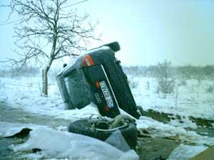 Un grav accident de circulatie a avut loc ieri dupa-amiaza, pe DE 574, pe raza comunei Colonesti, din judetul Olt, din cauza neatentiei soferului si a zapezii de pe carosabil. Lucian George Neacsu, patron al unei firme din Slatina, se afla la volanul autoturismului proprietate personala Audi A6, cu numarul de inmatriculare OT-02-NUJ, si se indrepta spre municipiu. In jurul orei 15.30, soferul a pierdut controlul asupra directiei de mers, iar masina a derapat, s-a lovit de un copac de pe marginea drumului si s-a rasturnat intr-un sant. Conducatorul auto a scapat cu leziuni usoare, cei doi pasageri din masina, un baiat si o fata, fiind raniti mai grav. Andrei Cioran, de 17 ani, nu a putut fi scos initial din masina, solicitindu-se interventia autospecialei de descarcerare a Inspectoratului pentru Situatii de Urgenta „Matei Basarab“ Olt. Autospeciala nu a mai ajuns la locul accidentului, ambulantierii reusind sa-l scoata pe tinar dintre fiarele masinii. Deoarece ranile baiatului erau foarte grave, doctorii de la camera de garda a Spitalului Judetean din Slatina au decis sa fie transportat la Bucuresti. Celalalt pasager, Roxana Nicola, de 25 de ani, nu a suferit rani care sa necesite internarea in spital. Politistii continua cercetarile pentru a stabili conditiile in care s-a produs accidentul.