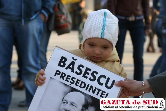 Câteva sute de persoane, copii, tineri şi bătrâni, s-au strâns aseară în Piaţa Prefecturii din Craiova, unde au manifestat purtând pancarte cu portretul preşedintelui Traian Băsescu. „Băsescu preşedinte!“, au strigat craiovenii, care şi-au exprimat dezacordul împotriva deciziei parlamentului de a-l suspenda din funcţie pe şeful statului. Unii oameni au avut pancarte pe care scria „Jos Tăriceanu!“. Numărul celor prezenţi aseară în centrul Băniei creştea de la oră la oră, aceştia susţinând că Traian Băsescu este singurul preşedinte potrivit pentru România.