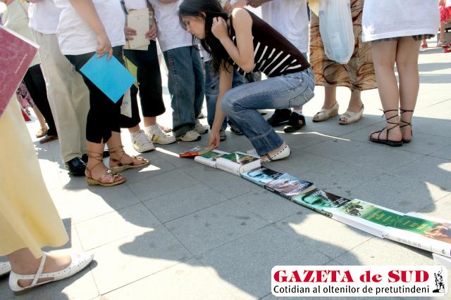 Preşcolari, elevi de gimnaziu şi de liceu s-au adunat ieri în Piaţa socio-umană din Craiova la acţiunea „Cartea cea mai lungă“, din cadrul campaniei „Te-am prins citind, te premiem“ lansate de Direcţia Judeţeană pentru Tineret Dolj, Biblioteca Judeţeană „Alexandru şi Aristia Aman“, Inspectoratul Şcolar Judeţean Dolj şi Facultatea de Litere, Gazeta de Sud şi Radio Sud fiind parteneri media.