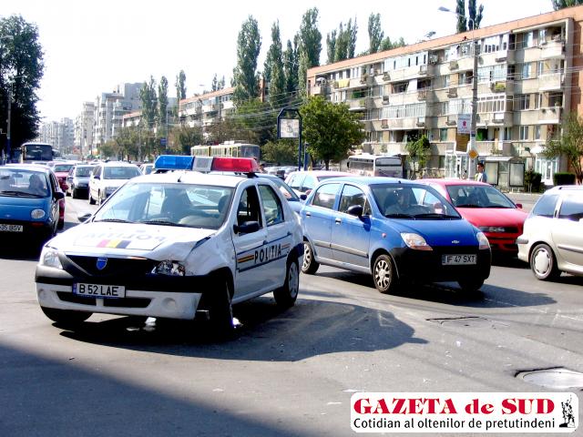 O şoferiţă a intrat cu autoturismul într-o maşină de poliţie aflată în misiune, la intersecţia străzilor Calea Bucureşti şi Horia, în zona Rotonda. Incidentul s-a produs ieri după-amiază, când misiunea a doi poliţişti criminalişti a fost oprită brusc de Cristina Liliana Costea, din Craiova, aflată la volanul unui autoturism Nubira, cu numărul de înmatriculare DJ-07-JPL. Conform unor surse din cadrul IPJ Dolj, cei doi lucrători ai Biroului de Criminalistică se aflau în misiune, în urma unui apel la telefonul de urgenţă 112. Şoferiţa, cu zece ani de experienţă la volan, venind de pe strada Horia, nu a acordat prioritate maşinii de poliţie, care avea semnalele luminoase şi sonore în funcţiune. „Nu am auzit“, a explicat Liliana Costea. În urma impactului, poliţistul aflat pe scaunul din dreapta faţă s-a lovit la umăr, iar autoturismul a rămas în intersecţie, îngreunând traficul pe bulevardul Calea Bucureşti. „Urmează să facem cercetări şi în funcţie de rezultatul cercetărilor vom trage concluziile“, a declarat subcomisarul Stelu Belu, prezent la faţa locului.