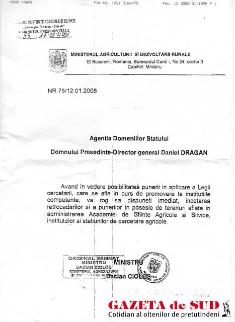 Răspândindu-se ca fulgerul vestea cum că singurul scop al actualului prefect este acela de a termina staţiunile de cercetare agricolă din judeţ, cei câţiva directori care au rămas s-au plâns forului tutelar, Academia de Ştiinţe Agricole „Gheorghe Ionescu Siseşti“, de acţiunile acestuia. Cum era de aşteptat, Academia s-a plâns la ministrul agriculturii, Dacian Cioloş, iar acesta, la rândul lui, a trimis o adresă Agenţiei Domeniilor Statului (ADS), prin care o somează să înceteze imediat retrocedările pe terenurile aflate în administrarea Academiei, institutelor şi staţiunilor de cercetare. Ministrul Cioloş atenţionează ADS că există posibilitatea punerii în aplicare a Legii cercetării agricole, care ar modifica datele problemei. „Având în vedere posibilitatea punerii în aplicare a Legii cercetării, care se află în curs de promovare la instituţiile competente, vă rog să dispuneţi imediat încetarea retrocedărilor şi a punerilor în posesie de terenuri aflate în administrarea Academiei…“, adresa nr. 76 din 12.01.2008 a Ministerului Agriculturii şi Dezvoltării Rurale, semnată de ministrul Dacian Cioloş. Surse din interiorul prefecturii ne-au declarat că un exemplar al acestei adrese există în prefectură, dar că nu a fost luat în seamă de nimeni. „Nu comentez această adresă. Nu mă interesează ce ne roagă ministrul pentru că eu am discutat cu el şi ne-am înţeles. Nu pot să spun ce am discutat. Eu respect doar legile existente, nu pe cele care vor fi cândva!“, a spus Dumitru.