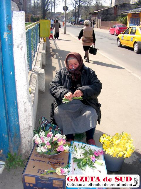 Mamaie Constantina povesteşte că şi cu ani în urmă, pe când muncea la colectiv, florile îi umpleau grădina. „Cum ieşeam de la CAP, veneam şi vindeam la piaţă. Pe timpul lui Ceauşescu mi le lua lumea din mână. Da’ acum nu mai cumpără aşa mulţi, că nu mai au oamenii bani. Sunt bătrână şi eu, dar nici nu zici că am 70 de ani, că pot să muncesc. Nu mă odihnesc, că-n groapă o să am destul timp şi pentru asta. Mai bine vin aici între tinereţe. Şi florile mele sunt frumoase ca fetele şi nu sunt scumpe. Alţii dau trandafirul cu cinci lei, cu şapte, iar eu îl am la 2,5 lei şi al meu are miros, nu e searbăd ca ăia mari şi frumoşi din străinătăţuri. Şi zambilele, mamă, le dau cu 1,5 lei buchetul. Să veniţi pe la mine, că dacă n-aveţi bani, puteţi să luaţi şi aşa…“, zâmbeşte bătrâna florăreasă, între zambile şi narcise.