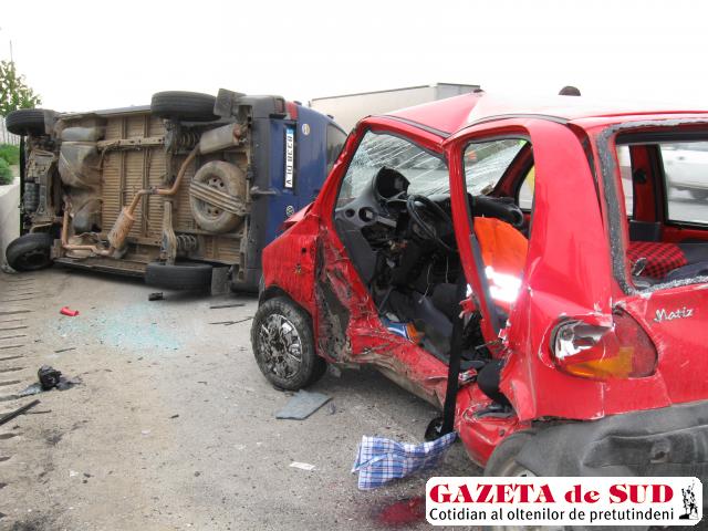 Ion Doru Şchiopârlan, de 31 de ani, din comuna Coţofenii din Dos, conducea un Matiz, în această dimineaţă, în jurul orei 07.00, pe drumul judeţean 606F. Din primele cercetări ale poliţiştilor de la rutieră doljeni s-a stabilit că, la intersecţia cu DE 70, Craiova-Filiaşi, şoferul Matizului nu a acordat prioritate de trecere unui microbuz VW Transporter, condus de Mihăiţă Bălan, de 27 de ani, din Turnu Măgurele – Teleorman, care se deplasa regulamentar către Craiova. Matizul a fost lovit în plin, în partea stângă, după care ambele maşini s-au răsturnat şi au ajuns pe celălalt sens de mers. În urma impactului violent şi-au pierdut viaţa pe loc Constantin Şchiopârlan, de 61 de ani şi Domnica Băluţă, de 57 de ani, pasageri în Matiz. Doru Şchiopârlan, Statie Băluţă, de 59 de ani şi Aurică Ion, de 70 de ani, au fost transportaţi la Spitalul de Urgenţă Craiova de ambulanţele SMURD sosite la faţa locului.