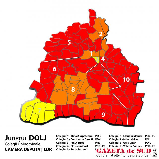 Lista parlamentarilor de Dolj a fost definitivată ieri de atribuirea mandatelor prin distribuire şi redistribuire de birourile electorale local şi naţional. PSD+PC a obţinut în Dolj două mandate de senator şi cinci de deputaţi, PD-L are doi senatori şi trei deputaţi, iar PNL a adunat un senator şi doi deputaţi.