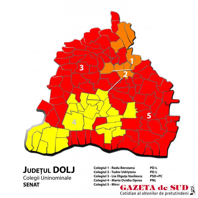 Reprezentanţii Biroului Electoral Central au preluat datele transmise de birourile electorale judeţene şi de direcţiile regionale de statistică şi au calculat redistribuirea mandatelor. În Dolj, unul din cele două mandate de senator a revenit în final PD-L-ului prin Tudor Udriştoiu, directorul Spitalului de Neuropsihiatrie din Craiova, care a câştigat mandatul, deşi s-a situat pe locul al doilea la alegerile din colegiul său. Celălalt mandat neatribuit în prima etapă i-a revenit la redistribuire PNL, adică lui Mario Ovidiu Oprea, care s-a situat pe locul al treilea în Colegiul Băileşti-Calafat.