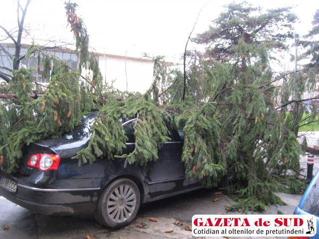 Un brad de pe platoul Teatrului Naţional "Marin Sorescu", din Craiova, a fost smuls de vânt în această dimineaţă şi aruncat pe un autoturism Volkswagen Passat, parcat regulamentar. Pagubele nu au fost estimate până la această oră, fiindcă bradul încă nu a fost ridicat, iar proprietarul maşinii nu şi-a văzut "cadoul". Reprezentanţii Regiei Autonome de Administrare a Domeniului Public şi Fondului Locativ Craiova spun că bradul a cedat rafalelor de vânt din cauză că apa bălteşte la rădăcină, unde s-au format cratere în urma lucrărilor de modernizare a platoului Teatrului Naţional "Marin Sorescu". Cristian Ignat, antreprenorul investiţiei de la teatru, nu a răspuns la telefon.