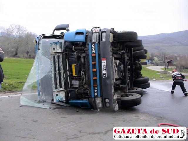 Mehedinţi: Drum blocat de o betonieră răsturnată