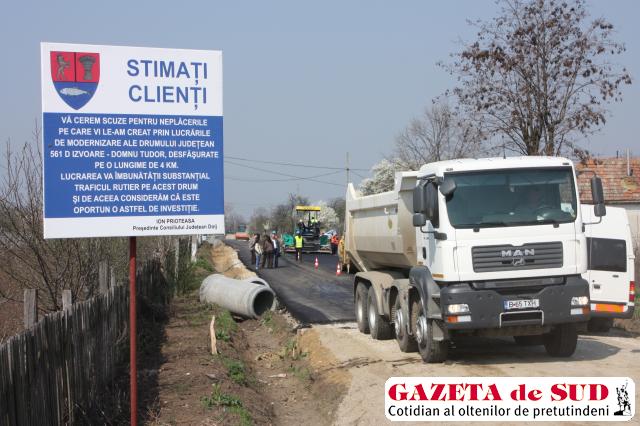 Trei milioane de lei sub formă de balast, piatră, mixtură asfaltică şi ciment se „duc“ pe drumul principal din satul Domnul Tudor al comunei Izvoare. Sunt cam ultimii bani dintr-un credit făcut de Consiliul Judeţean (CJ) Dolj în urmă cu doi ani la Banca Comercială Română. Ieri, oficialităţile CJ au mers pe şantierul din sat într-o inspecţie, la care a fost invitată şi presa locală. De lipsit, a lipsit primarul liberal al comunei. Lucrările au început dintr-un capăt al satului, din dreptul unei plăcuţe prin care CJ îşi cere scuze pentru neplăcerile cauzate de lucrări faţă de „stimaţii clienţi“ care circulă pe drumul judeţean. S-a turnat asfalt pe o bandă, însă numai până la biserică, pe un sector de câteva sute de metri. De aici, alte echipe pregătesc „terenul“, toarnă balast peste care tasează piatra, sapă şanţurile de la margine şi construiesc din ciment podeţe la intrările în curţi. Firma care modernizează drumul are termen până în luna iulie să finalizeze cei patru kilometri, până la Izvoare, altfel riscă să nu îşi mai primească banii.