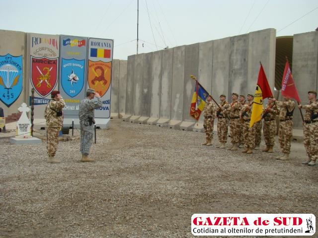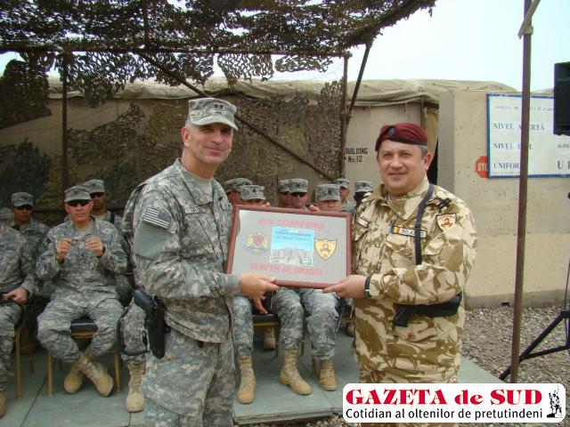Infanteriştii de la Craiova aflaţi sub comanda locotenent colonelului dr. Gabriel Toma au organizat un ceremonial la care a fost prezent şi generalul de brigadă Cătălin Tomescu – Seniorul Reprezentativ al Armatei României în Irak. După arborarea drapelelor Statelor Unite ale Americii şi cel al României şi după scurte alocuţiuni ale comandanţilor prezenţi, generalul de brigadă Tomescu a oferit unor militari americani înalte distincţii ale ministrului apărării, Şefului Statului Major General al Armatei României şi Şefului Statului Major al Forţelor Terestre Române .