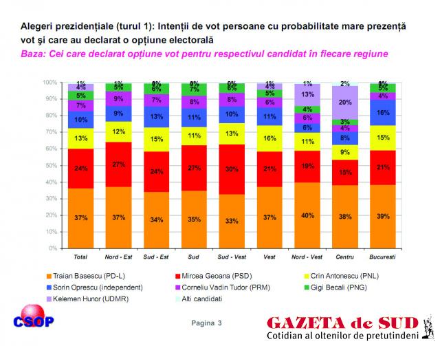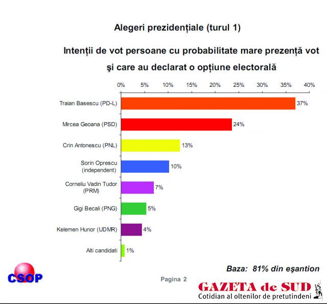 Potrivit sondajului, în primul tur de scrutin, Traian Băsescu ar obţine 37% din voturi, Mircea Geoană – 24%, Crin Antonescu – 13%. Sorin Oprescu ar câştiga 10% din voturile cetăţenilor, Corneliu Vadim Tudor – 7%, Gigi Becali – 5%, Kelemen Hunor – 4%.