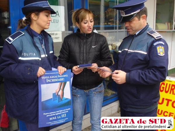 Poliţişti, jandarmi şi reprezentanţi ai ISU Dolj s-au aflat în Piaţa Socio-Umană Mihai Viteazu şi în Piaţa Centrală din Craiova, unde au împărţit cetăţenilor pliante cu sfaturi preventive şi le-au explicat acestora faptul că pe timpul campaniei electorale şi în ziua alegerilor în cazul în care constată încălcări ale prevederilor legale, trebuie să sune imediat la SNUAU 112 pentru a sesiza acest lucru. Totodată, pe pliantul respectiv sunt menţionate mai multe fapte de natură penală şi contravenţională care se pot comite în această perioadă şi care pot avea ca subiect activ cetăţeanul de rând.
