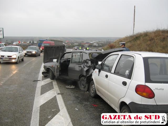 Trei persoane au fost rănite,astăzi, pe DE 574, pe raza localităţii doljene Pieleşti, după ce şoferul unui autoturism Dacia a pierdut controlul direcţiei şi a intrat pe contrasens, unde a lovit două autoturisme care circulau din sens opus. Conform poliţiştilor din cadrul Biroului Rutier Craiova, în jurul orei 16.00, Ionel Mihai, de 39 de ani, din Balş, care conducea o Dacia 1310, cu numărul OT-11-MCY, dinspre Balş către Craiova, pe raza localităţii Pieleşti, într-o curbă la stânga, a pierdut controlul direcţiei şi a pătruns pe contrasens. Dacia a acroşat un VW Golf condus de Elena Dincă, de 42 de ani, din Slatina, care circula regulamentar din sens opus, după care s-a răsucit şi a tamponat violent cu spatele un Matiz, cu numărul OT-94-EVE, condus dinspre Craiova către Balş de Ioana Ivănescu, de 46 de ani, din Balş. Trei persoane au fost rănite, în urma impactului dintre Dacie şi Matiz. Ambii şoferi şi pasagera de pe locul din dreapta-faţă al Matizului au suferit leziuni, care au necesitat internarea în Spitalul de Urgenţă Craiova. Amănunte în Gazeta de Sud.