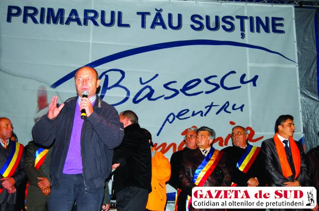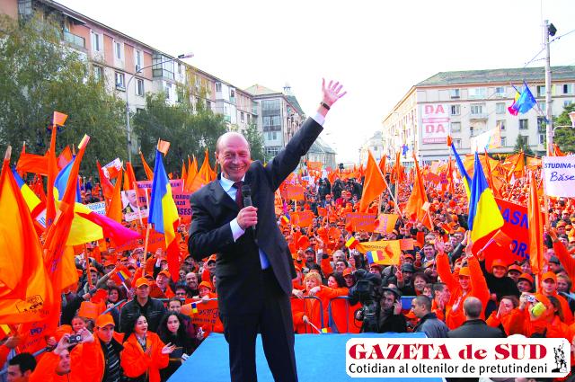 „Bine v-am găsit, urmaşi ai pandurilor lui Tudor!“, a început Traian Băsescu sâmbătă discursul în faţa a circa 4.000 de oameni, de pe scena ridicată pe malul Dunării. Susţinătorii preşedintelui în funcţie, echipaţi în portocaliu, au venit în Portul Cetate din comunele din sudul judeţului, alături de primarii democrat-liberali, dar şi de primarul Craiovei, Antonie Solomon. Acesta, în discursul său, l-a amintit pe Mircea Dinescu, care se afla în public şi căruia i-a transmis că „îl trimit pe malul drept al Dunării. Acolo să petreacă cinci ani de zile, iar eu îi voi administra moşia“. Şeful statului a continuat cu „câteva cuvinte despre un mandat greu, un mandat în care am fost într-o confruntare dură şi cu o majoritate în parlament, dar şi cu presa mogulilor. Asta nu m-a descurajat nici o clipă“. Băsescu a spus că România a mai avut un preşedinte care, la terminarea mandatului, a declarat că „pe mine m-au înfrânt structurile“. „Pe mine nu m-au înfrânt. Ce-i drept, nici eu nu am reuşit să le înfrâng pe ele, dar am obligaţia să continuu pentru că ţara asta trebuie dată în totalitate înapoi românilor“, a declarat preşedintele Băsescu în faţa susţinătorilor săi.