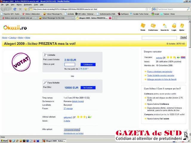 Unul dintre cititorii noştri ne-a anunţat despre românul care a scos la licitaţie prezenţa sa la vot printr-un mesaj trimis la Reporter GdS. Bucureşteanul în cauză, care s-a înscris printre utilizatorii paginii de licitaţii on line în octombrie 2006, fiind un utilizator cu credibilitate 100% în urma tranzacţiilor făcute prin intermediul website-ului, a anunţat că: „Atenţie!!! Nu-mi vând votul vreunui candidat! Lista candidaţilor m-a pus în dubiu dacă să mă prezint sau nu la alegerile din 22 noiembrie 2009, aşa încât recurg la această metodă: dacă dumneavoastră, prin sumele licitate, mă convingeţi, mă voi prezenta la vot şi îmi voi îndeplini sarcina de «cetăţean responsabil». În ultimii 13 ani am fost prezent la mai toate scrutinurile organizate în România şi… degeaba. Mereu m-am întrebat «ce-mi iese dacă votez?» şi întotdeauna am fost dezamăgit de rezultat. De data aceasta, vreau ceva concret pentru a mă deplasa la secţia de votare. Vreau să fiu plătit pentru îndeplinirea acestei ingrate «sarcini cetăţeneşti»“. Acesta continuă spunând: „Ceea ce ofer eu aici nu este nici ilegal (voi vota cu cine consider eu de cuviinţă la momentul respectiv, nu mi se va putea impune vreun candidat), nici imoral (votul nu este obligatoriu, aşa că pot pune condiţii pentru a mă prezenta)“. În anunţul său, bucureşteanul a transmis rugămintea să nu se liciteze decât în cazul în care oferta este serioasă, iar cei care licitează sunt hotărâţi şi dispuşi să achite serviciul solicitat. Licitaţia avea termenul 19 noiembrie, iar plata trebuia să se facă până în ziua alegerilor, în numerar sau prin virament bancar, comisioanele fiind suportate de cumpărător. Ca dovadă a faptului că a votat, autorul anunţul a precizat că îi va trimite câşigătorului un scan după actul de identitate, cu timbrul autocolant lipit pe verso.