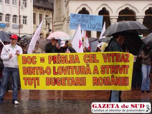 Pe pancartele angajaţilor nemulţumiţi erau înscrise mesaje pentru guvernanţi: “Jos Guvernul mizerabil”, “Boc= Prîslea cel Viteaz, dintr-o lovitură a strivit toţi bugetarii României”, “Vrem drepturi salariale conform Legii 330/2009”. Vreme de două ore, bugetarii au scandat lozinci anti-Guvern.  Protestatarii sunt nemulţimiţi că salariile le-au fost înjumătăţite: pentru luna februarie, salariile au fost diminuate cu circa 30%, iar pentru luna martie le vor primi reduse cu 50%. De asemenea, sporul de 75% pe care îl primeau pentru că lucrează cu persoane grav bolnave, cu handicapuri severe psihice şi locomotorii, a fost anulat printr-o decizie venită la Agenţia pentru Prestaţii Sociale Gorj de la Guvern.