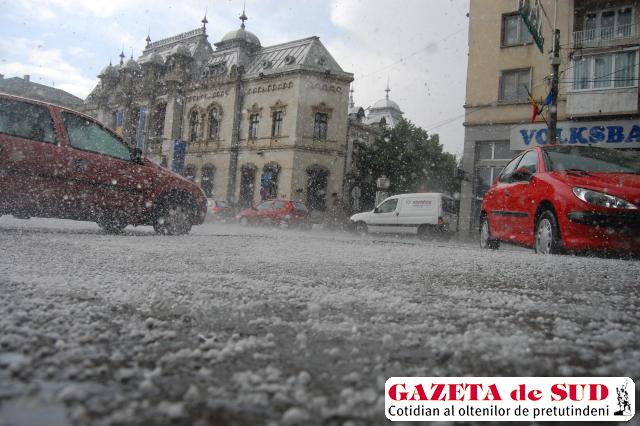 O ploaie torenţială însoţită de grindină s-a abătut asupra Craiovei cu puţin timp în urmă. Străzile au fost acoperite de un strat de gheaţă, iar după cinci minute a ieşit soarele.