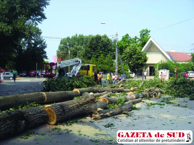 Şase plopi uriaşi din curtea SCM „Stăruinţa“, din Craiova, au fost doborâţi ieri de echipele Regiei Autonome de Administrare a Domeniului Public şi Fondului Locativ (RAADPFL) Craiova. Copacii au fost consideraţi pericol public, după ce crengi imense sau chiar trunchiuri din aceştia au căzut peste clădiri şi maşini aflate pe domeniul public, la vijelii, trăsniţi sau pur şi simplu. Fiindcă, din cauza înălţimii, pomii nu mai puteau fi curăţaţi, RAADPFL a decis, în urma nenumăratelor cereri ale SCM „Stăruinţa“ şi a evenimentului din 14 iunie 2010, când patru maşini au fost grav avariate, să-i culce de la temelie. Autorităţile spun că intervenţia se impunea pentru a fi asigurată siguranţa oamenilor. „Acţiunea este de mare risc, având în vedere că în zonă sunt câteva chioşcuri practic lipite de plopi. Dar trebuia să ne asumăm acest risc, decât să lăsăm să se întâmple, Doamne-fereşte!, să cadă pe oameni, aşa cum era gata-gata să se întâmple de atâtea ori“, a spus directorul Ion Petre, de la RAADPFL. Pe 14 iunie, trunchiul unuia dintre plopii de la „Stăruinţa“ a crăpat şi s-a prăbuşit peste maşinile din parcarea de pe strada Dimitrie Gerota, trecând în cădere pe lângă un chioşc metalic în care se aflau oameni.