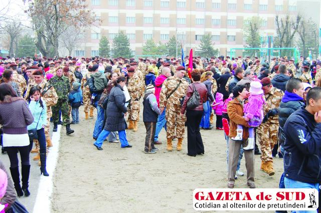 La sediul Batalionului 20 Infanterie „Scorpionii Negri“ din Craiova a avut loc vineri ceremonia militară şi religioasă prilejuită de plecarea în misiune în teatrul de operaţii din Afganistan a celor 664 de militari craioveni. Rudele s-au înghesuit să-i vadă pe cei dragi, în cadrul unui ceremonial la care au luat parte autorităţi centrale şi locale.