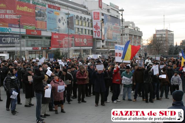 Câteva sute de craioveni s-au adunat azi în Piaţa Prefecturii, pentru manifesta împotriva guvernului şi pentru a cere demisia preşedintelui Băsescu. Manifestanţii au afişat pancarte pe care erau scrise mesaje împotriva preşedintelui şi a guvernului. La fel ca şi în ultimele zile, mitingul de azi este supravegheat de forţele de ordine din cadrul Inspectoratului de Jandarmi al Judeţului Dolj.