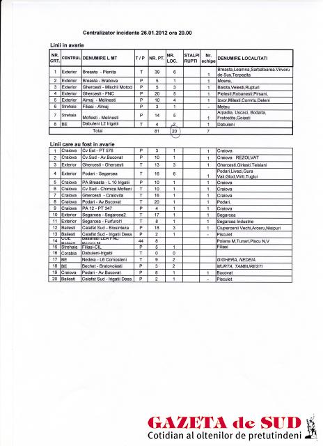 Prefectura Dolj a anunţat în această dimineaţă bilanţul făcut în timpul unei videoconferinţe desfăşurate aseară, la ora 21.30, pe tema situaţiei create în urma căderilor de zăpadă din ultimele zile. La acea oră, pe toate drumurile judeţene şi naţionale din judeţ se circula în condiţii de iarnă. Circulaţia autotrenurilor era întreruptă prin PTF Bechet ca urmare a închiderii portului Oreavoho din cauza codului roşu de ninsoare instituit în Bulgaria, iar Aeroportul Internaţional Craiova era închis, două curse de pasageri pe ruta Craiova-Roma fiind anulate. De asemenea, în 20 de localităţi era întreruptă furnizarea energiei electrice.