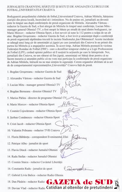 Jurnaliştii craioveni au semnat joi un protest împotriva reprezentanţilor clubului de fotbal „Universitatea“ Craiova, denunţând agresiunile la care au fost supuşi în timpul mandatului lui Adrian Mititelu la club. Redăm mai jos integral textul protestului semnat de ziarişti: