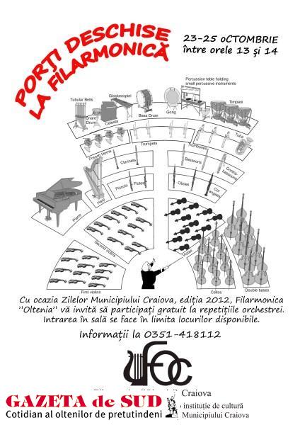 Cu ocazia Zilelor Municipiului Craiova, ediţia 2012, Filarmonica „Oltenia” îi invită pe craioveni, marţi, 23 octombrie, miercuri, 24 octombrie şi joi, 25 octombrie, între orele 13:00 – 14:00, să participe gratuit la repetiţiile orchestrei simfonice. Intrarea în sala de concerte se face în limita locurilor disponibile. Informaţii suplimentare se pot obţine la numărul de telefon 0351.418.112.