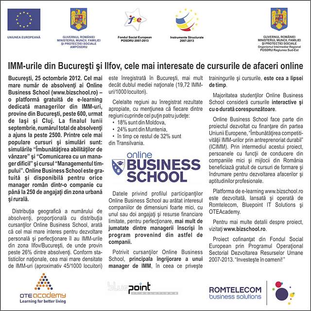 Bucureşti, 25 octombrie 2012. Cel mai mare număr de absolvenţi ai Online Business School (www.bizschool.ro) – o platformă gratuită de e-learning dedicată managerilor din IMM-uri, provine din Bucureşti, peste 600, urmat de Iaşi şi Cluj. La finalul lunii septembrie, numărul total de absolvenţi a ajuns la peste 2500. Printre cele mai populare cursuri şi simulări sunt: simulările “Îmbunătăţirea abilităţilor de vânzare” şi “Comunicarea cu un manager dificil” şi cursul “Managementul timpului”. Online Business School este gratuită şi disponibilă pentru orice manager român dintr-o companie cu până la 250 de angajaţi din zona urbană şi rurală.