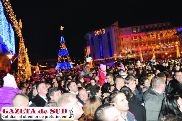 Peste 2.000 de târgujieni au asistat sâmbătă la punerea în funcţiune a iluminatului de Sărbători. Municipalitatea a montat în tot oraşul câţiva kilometri de ghirlande şi peste 200 de brăduţi luminoşi. De asemenea, în centrul municipiului Târgu Jiu a fost instalat un pom de iarnă din plastic. Lungimea bradului artificial depăşeşte 22 de metri, fiind cel mai înalt din ultimii ani. Festivitatea de punere în funcţiune a iluminatului festiv a început la ora 18.00, cu un discurs al primarului Florin Cârciumaru. Edilul-şef a declarat că acţiunea de montare a figurinelor luminoase va continua până în preajma Sărbătorilor, întrucât se doreşte ca în toate cartierele să fie ghirlande luminoase specifice Crăciunului şi Anului Nou. Tot în Târgu Jiu vor mai fi aduse şi două sănii trase de reni. Una va fi aşezată în centrul oraşului, iar cea de-a doua în zona 9 Mai.