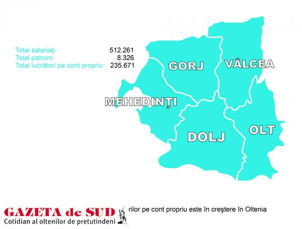 Deschiderea unei afaceri personale sau lucrul pe cont propriu, sub formă de PFA sau ca un liber profesionist, pare să fie o modă în Oltenia. Tot mai mulţi tineri se aventurează să îşi deschidă o afacere şi tot mai mulţi desfăşoară o activitate aducătoare de venituri, pe cont propriu. Structura populaţiei ocupate după statutul profesional la nivelul Regiunii de Dezvoltare Sud-Vest Oltenia, în trimestrul al III-lea 2012, arată că numărul patronilor şi al persoanelor care lucrează pe cont propriu a ajuns aproape la nivelul a 50% din rândul celor care sunt angajaţi în sectorul privat sau de stat. La data analizată, populaţia ocupată a Olteniei era de 1.017.852 de persoane, din care circa jumătate erau salariaţi (512.261 de persoane), iar 8.326 sunt patroni. De asemenea, 235.761 de persoane lucrează pe cont propriu, ceea ce reprezintă tot un procent important din totalul persoanelor ocupate. Un simplu calcul matematic ne arată că deţinătorii de firme şi lucrătorii pe cont propriu, care sunt 244.087 de persoane, reprezintă aproximativ jumătate din numărul salariaţilor din întreaga regiune.