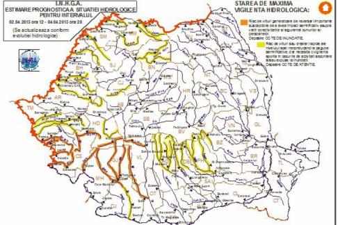 Având în vedere situaţia hidrometeorologică actuală şi emiterea Atenționării meteorologice nr.1 și nr.2, ce vizează producerea de precipitații în următoarele 48 de ore, se actualizează AVERTIZAREA HIDROLOGICA nr.26, conform datelor emise de Institutul Național de Hidrologie și Gospodărire a Apelor, pentru perioada: 02.04.2013 ora 12:00 – 04.04.2013 ora 20:00, după cum urmează: