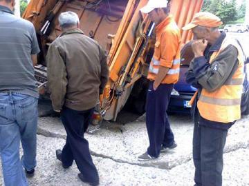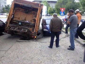 Maşina de gunoi a fost, în cele din urmă, scoasă din groapă cu ajutorul unei macarale a Societăţii de Salubritate.