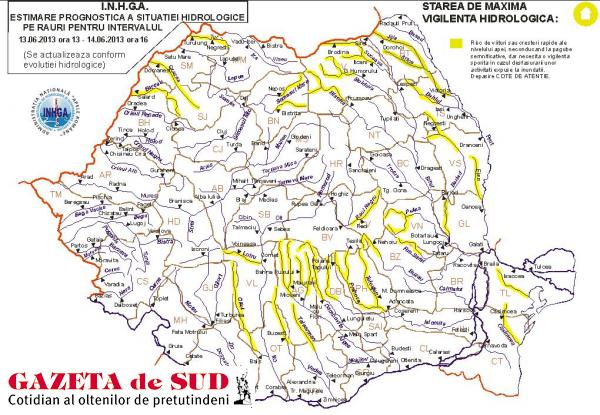 Institutul Naţional de Hidrologie şi Gospodăire a Apelor a emis o atenţionare hidrologică Cod Galben pentru următoarele bazine hidrografice, începând de astăzi, ora 13.00, şi până mâine, ora 16.00. Avertizarea se referă la râurile din bazinele hidrografice: Tur (judeţul Satu Mare), Someşul Mare (judeţul Bistriţa Năsăud), Crasna, Barcău (judeţele Sălaj, Satu Mare, Bihor), afluenţii Oltului superior din judeţul Covasna, afluenţii Oltului inferior din judeţele Gorj, Vălcea şi Olt, pe râurile din bazinele hidrografice superioare şi mijlocii ale: Vedei, Argeşului, Dâmboviţei, Ialomiţei, Prahovei şi Buzăului (judeţele Olt, Teleorman, Argeş, Dâmboviţa, Prahova, Buzău şi Covasna), pe râurile mici din bazinele hidrografice: Suceava, Moldova, Bistriţa (judeţul Suceava), Putna, Râmnicu Sărat (judeţele Vrancea şi Buzău), Jijia, Bârlad (judeţele Botoşani, Iaşi, Vaslui, Galaţi, Bacău şi Vrancea), afluenţii Prutului din judeţele Vaslui şi Galaţi şi pe râurile din Dobrogea (judeţele Constanţa şi Tulcea).