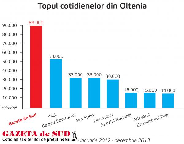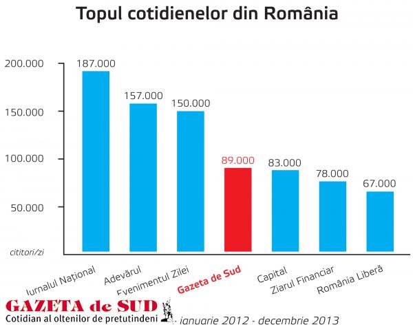Față de celelalte trei ziare locale și regionale pentru care SNA a furnizat cifre de audiență, Gazeta de Sud se află la o distanță remarcabilă, cu 89.0000 de cititori pe ediție, față de 42.000 de cititori cât înregistrează Obiectiv Vocea Brăilei, 41.000 de cititori – Viața Liberă Galați și 39.000 de cititori – Monitorul de Suceava. Audiența Gazetei de Sud a înregistrat o creștere de 1.000 de cititori pe ediție față de ultima perioadă pentru care SNA a publicat cifre de audiență, în timp ce cotidienele de calitate situate pe primele trei poziții în clasament au înregistrat o scădere a audienței. Jurnalul Național este citit de 187.000 de cititori pe ediție, față de 191.000, cât înregistra la livrarea SNA anterioară, Adevărul scade la 157.000 de cititori pe ediție față de 169.000, iar Evenimentul Zilei înregistrează o audiență de 150.000 de cititori pe ediție, față de 164.000.