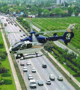 În elicopter, care aparține Inspectoratului General de Aviație al MAI, se află un polițist care transmite informații echipajelor de poliție rutieră aflate la sol, pentru ca acestea să poată interveni în caz de necesitate.