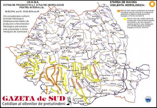 Institutul Naţional de Hidrologie şi Gospodărire a Apelor a actualizat avertizările Cod Portocaliu şi Cod Galben până astăzi la ora 18.00, pentru râuri din bazinele hidrografice Bega, Timiş, Bârzava, Moraviţa, Caraş, Nera, Cerna, Drincea, Desnăţui, Jiu, afluenţi ai Oltului mijlociu şi inferior, unii afluenţi ai Mureşului inferior, Vedea, Argeş superior, Ialomiţa, Buzău, unde se pot produce creşteri de debite şi niveluri, cu depăşirea cotelor de atenţie şi de inundaţie, precum şi scurgeri pe versanţi, torenţi şi pâraie, care ar putea provoca inundaţii locale.