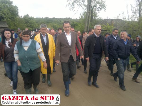 Premierul Victor Ponta a mers astăzi în zonele inundate din judeţul Mehedinţi, pentru a vedea pagubele produse de revărsarea apelor. „Oamenilor le vor fi împărţite apă, pături, mâncare, ce au nevoie”, a mai spus Ponta citat de b1.ro. „Regularizarea pârâului va rezolva problema”, a arătat premierul. Ponta le-a promis oamenilor că Guvernul va aloca „rapid” trei milioane de lei pentru regularizarea râului Desnăţui din comună şi că vor fi refăcute rigolele, din banii constructorului. Premierul le-a cerut reprezentanţilor Apelor Române detalii despre lucrările de regularizare care trebuie făcute pe râul Desnăţui, pentru lărgirea albiei. „Cei care au lucrat la drum şi-au bătut joc. Liviu Dragnea rămâne aici şi o să îi luăm pe cei care au avut contractul, din banii lor trebuie să facă spărturi să iasă apa”, a afirmat primul ministru.