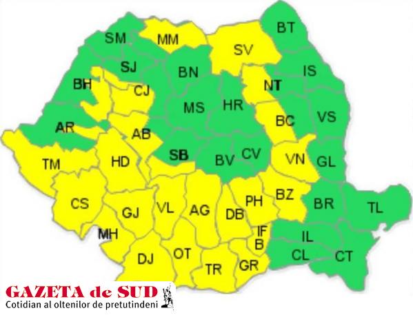 Potrivit atenţionării transmise de ANM, Codul Galben de ploi se va extinde în intervalul 14 mai, ora 12:00 – 15 mai, ora 18:00, în alte aproape 20 de judeţe din ţară, inclusiv în municipiul Bucureşti, între acestea numărându-se şi judeţele Olt şi Dolj. În intervalul menţionat instabilitatea atmosferică se va manifesta în cea mai mare parte a ţării prin averse, descărcări electrice, intensificări ale vântului şi izolat căderi de grindină. În regiunile sudice şi sud-vestice, precum şi în zonele de deal şi de munte, ploile vor avea caracter torenţial şi se vor acumula cantităţi de apă de peste 25-30 l/mp şi izolat peste 50-60 l/mp.