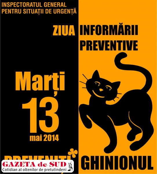 La rândul lor, cadrele ISU „Matei Basarab” al judeţului Olt vor organiza două puncte de informare preventivă în municipiile Slatina şi Caracal, în cadrul cărora vor fi distribuite materiale de informare al căror slogan este „Preveniţi ghinionul! – marţi 13 mai 2014”. Sediul ISU Matei Basarab al judeţului Olt îşi deschide porţile de la ora 10:00, iar la nivelul judeţului vor fi organizate acţiuni locale de informare preventivă de către Serviciile Voluntare pentru Situații de Urgenţă de la primăriile localităţilor din judeţ.