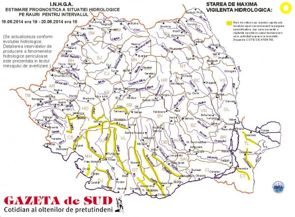 INGHA a instituit Cod Galben de inundaţii valabil în intervalul 18.06.2014, ora 19:00 – 20.06.2014, ora 18:00 în bazinele hidrografice mici din judeţele Caraş-Severin, Mehedinţi, Hunedoara, Gorj, Sibiu, Vâlcea, Argeş, Dâmboviţa şi Olt.