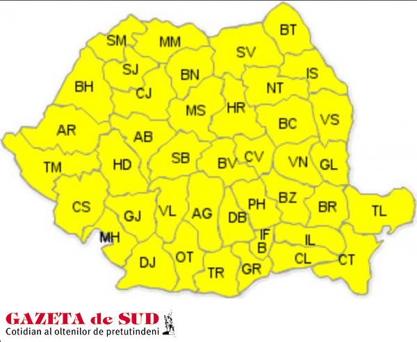 Administraţia Naţională de Meteorologie a emis o atenţionare de Cod Galben de instabilitate atmosferică accentuată, ploi însemnate cantitativ începând de astăzi, 25 iunie, ora 12.00, până mâine, 26 iunie, ora 6.00, pentru toată ţara.