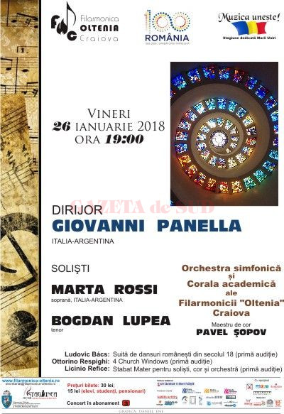 Orchestra Simfonică și Corala Academică ale Filarmonicii “Oltenia” Craiova, dirijate de maestrul Giovanni Panella (Italia-Argentina), prezintă vineri, 26 ianuarie, ora 19.00, un program integral în primă audiţie la Craiova: „Suită de dansuri românești din secolul 18” de Ludovic Bács, „4 vitralii” de Ottorino Respighi şi „Stabat Mater” pentru orchestră, cor şi solişti de Licinio Refice. Soliști sunt soprana Marta Rossi (Italia-Argentina) şi tenorul Bogdan Lupea, iar maestru de cor, Pavel Şopov.