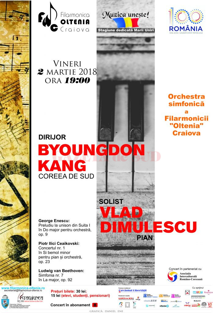 Filarmonica „Oltenia” va prezenta vineri, pe 2 martie, de la ora 19.00, un concert simfonic sub bagheta dirijorului Byoungdon Kang, din Coreea de Sud, în cadrul stagiunii dedicate Mrii Uniri. La pian va fi Vlad Dimulescu, iar în program vor fi următoarele piese: George Enescu: Preludiu la unison din Suita I în Do major pentru orchestră, op. 9
