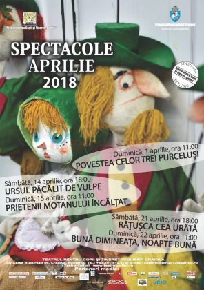 Teatrul „Colibri” a programat sâmbătă, 14 aprilie, de la ora 18.00, spectacolul Ursul păcălit de vulpe, de Ion Creangă, scenariul, regia şi scenografia de Valentin Dobrescu, muzica Alin Macovei – Moraru. În distribuție: Ionica Dobrescu, Daniel Mirea, Mugur Prisăcaru, Alla Cebotari, Adriana Ioncu, Emanuel Popescu.
