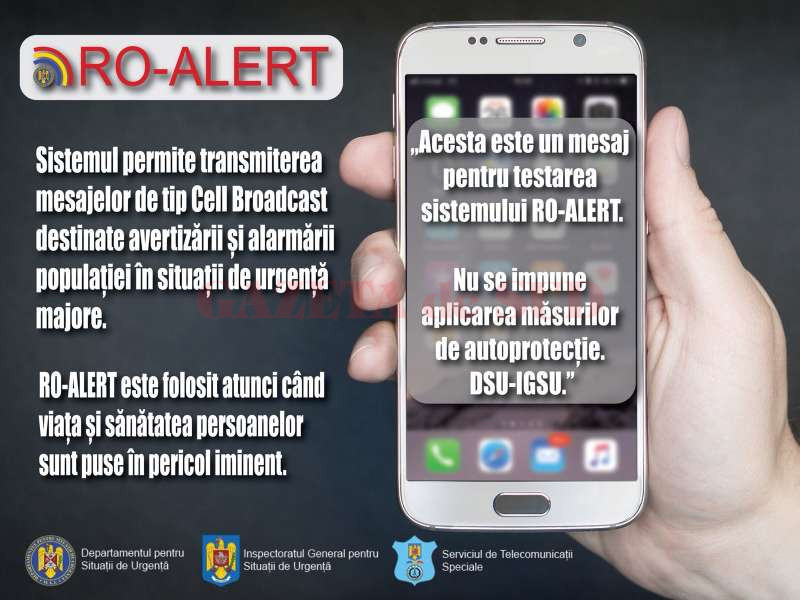 Astfel, în zonele unde acestea vor avea loc, pe terminalele conectate la reţelele operatorilor de telefonie mobilă din România, vor apărea notificări cu mesajul: Acesta este un mesaj pentru testarea sistemului RO-ALERT. Nu se impune aplicarea măsurilor de autoprotecţie DSU-IGSU.