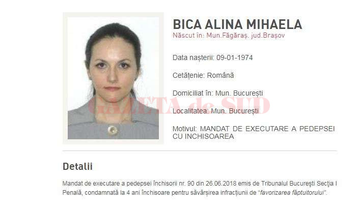 Fosta şefă a DIICOT, Alina Bica, condamnată definitiv la 4 ani de închisoare cu executare în dosarul în care era acuzată de favorizarea făptuitorului, a fost dată oficial în urmărire generală de Poliţia Română, care a postat pe site o fotografie a acesteia, scrie Agerpres.